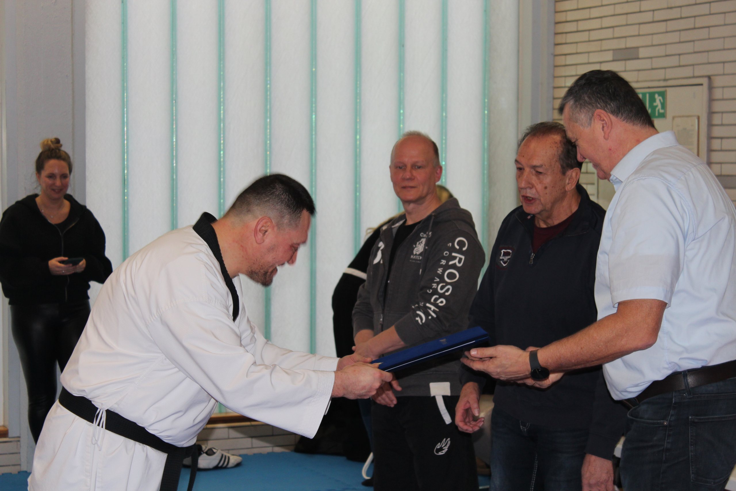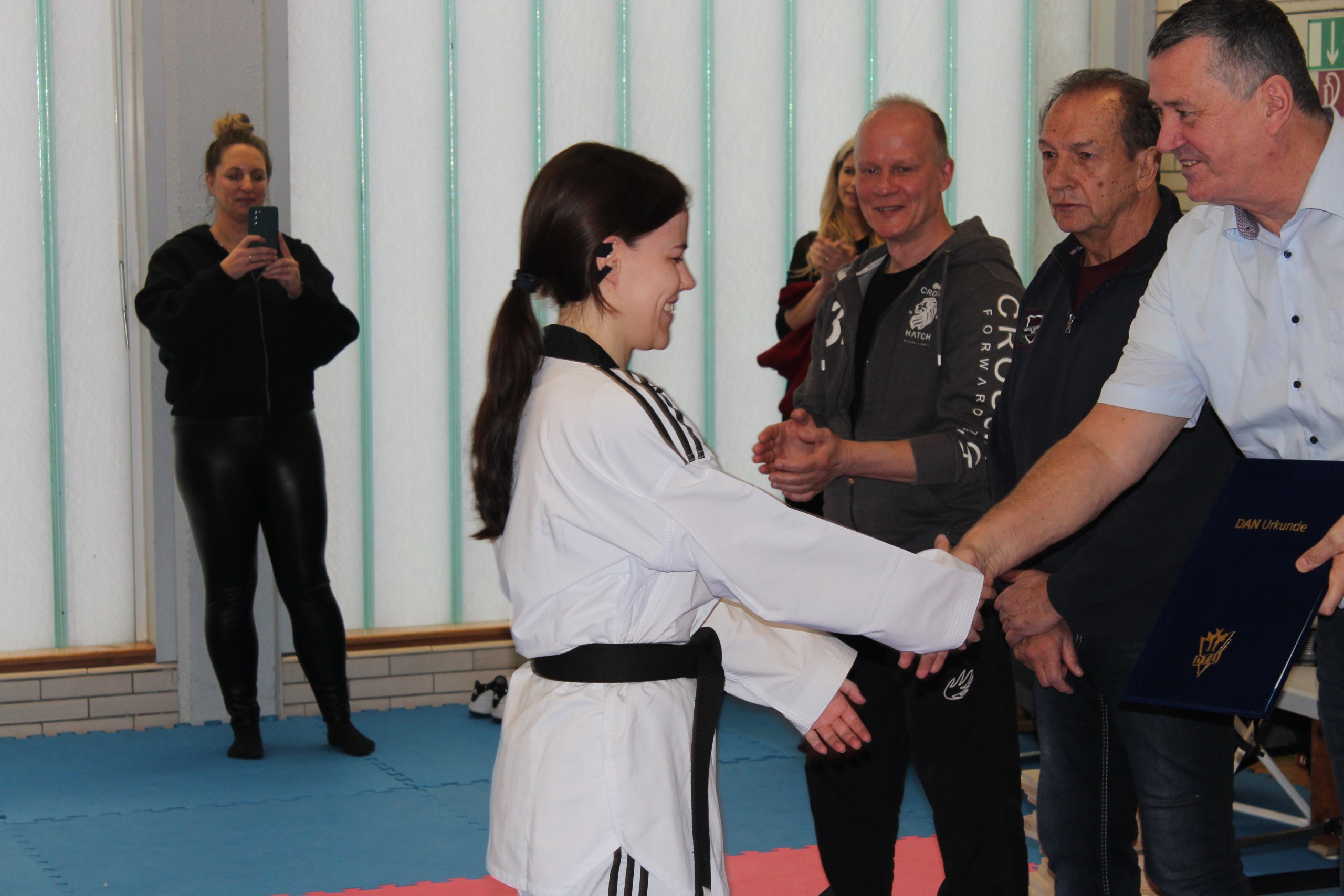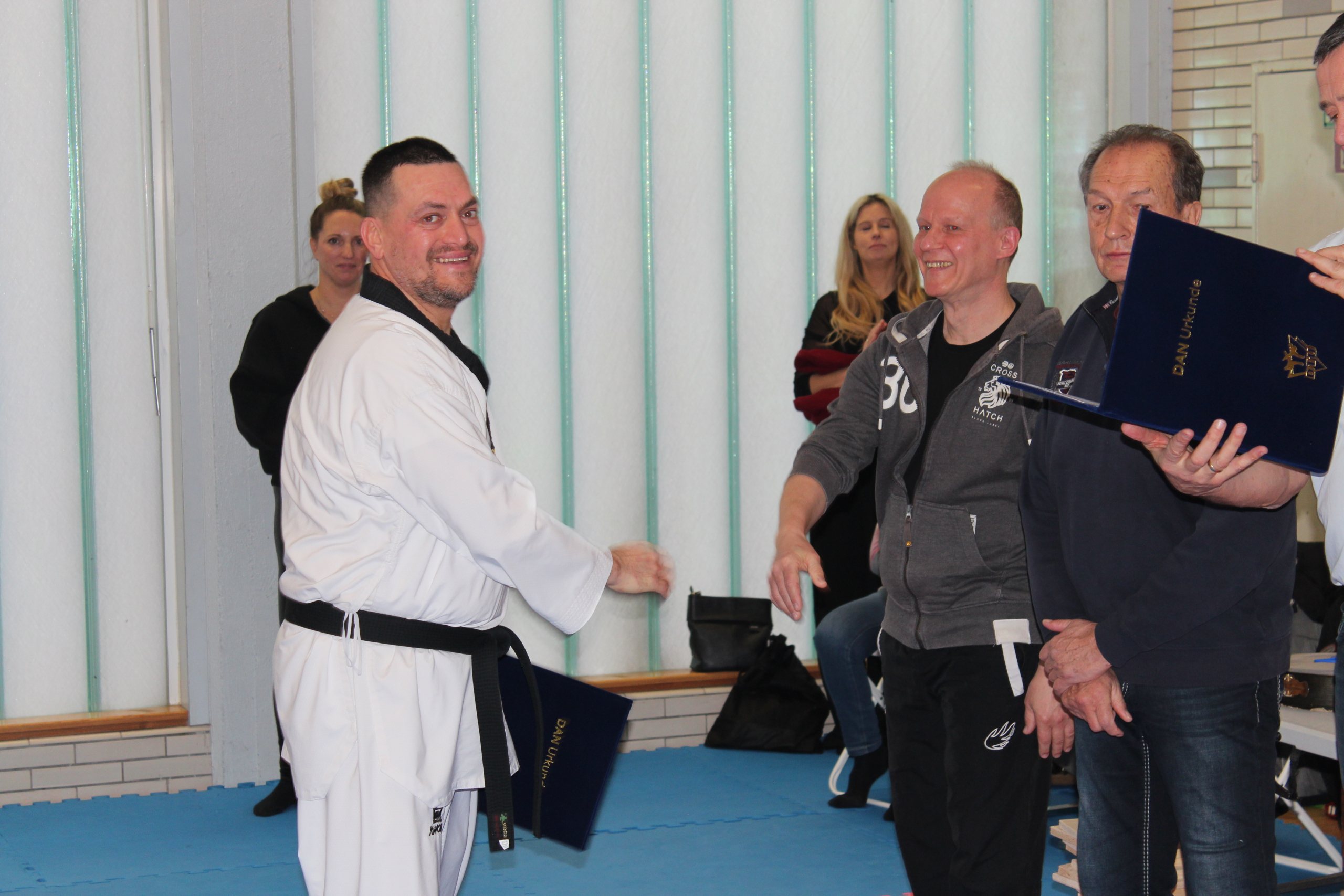 Reinhard Beermann (64 Jahre) stellte eindrucksvoll unter Beweis, dass Taekwondo keine Altersgrenzen kennt. Mit einer guten Leistung erreichte er den 3. DAN und unterstrich damit die lebenslange Leidenschaft und Hingabe für den Kampfsport.