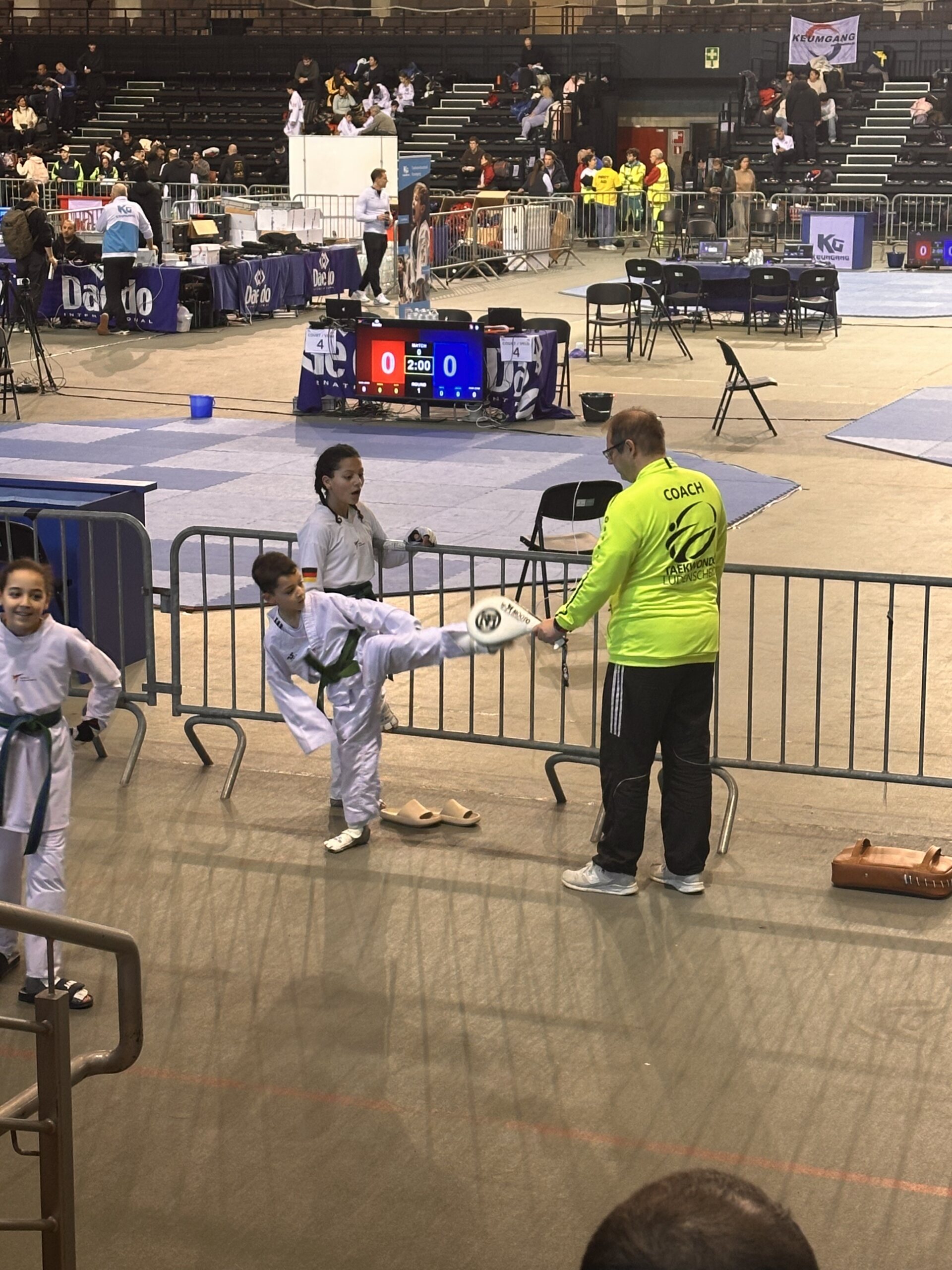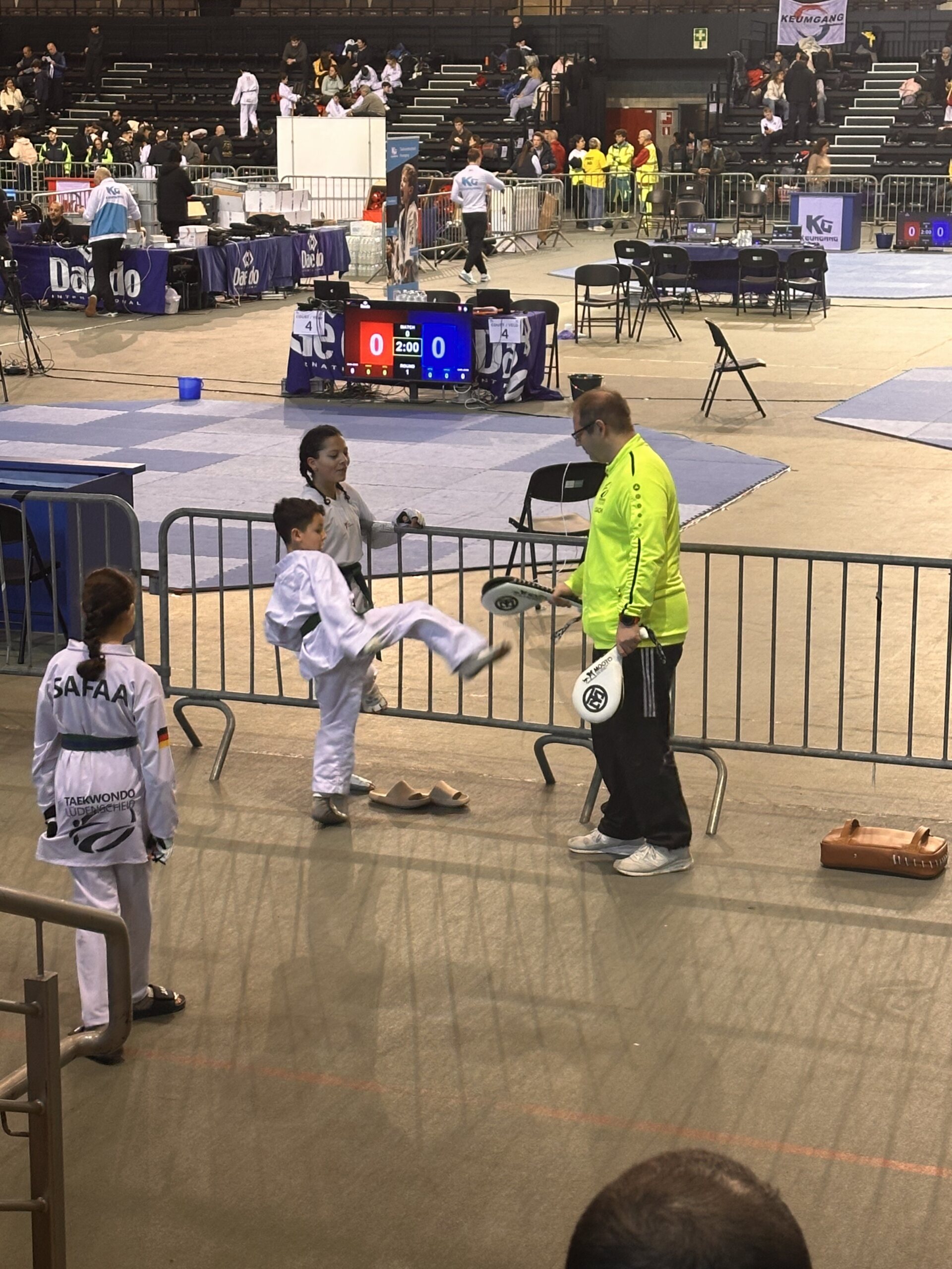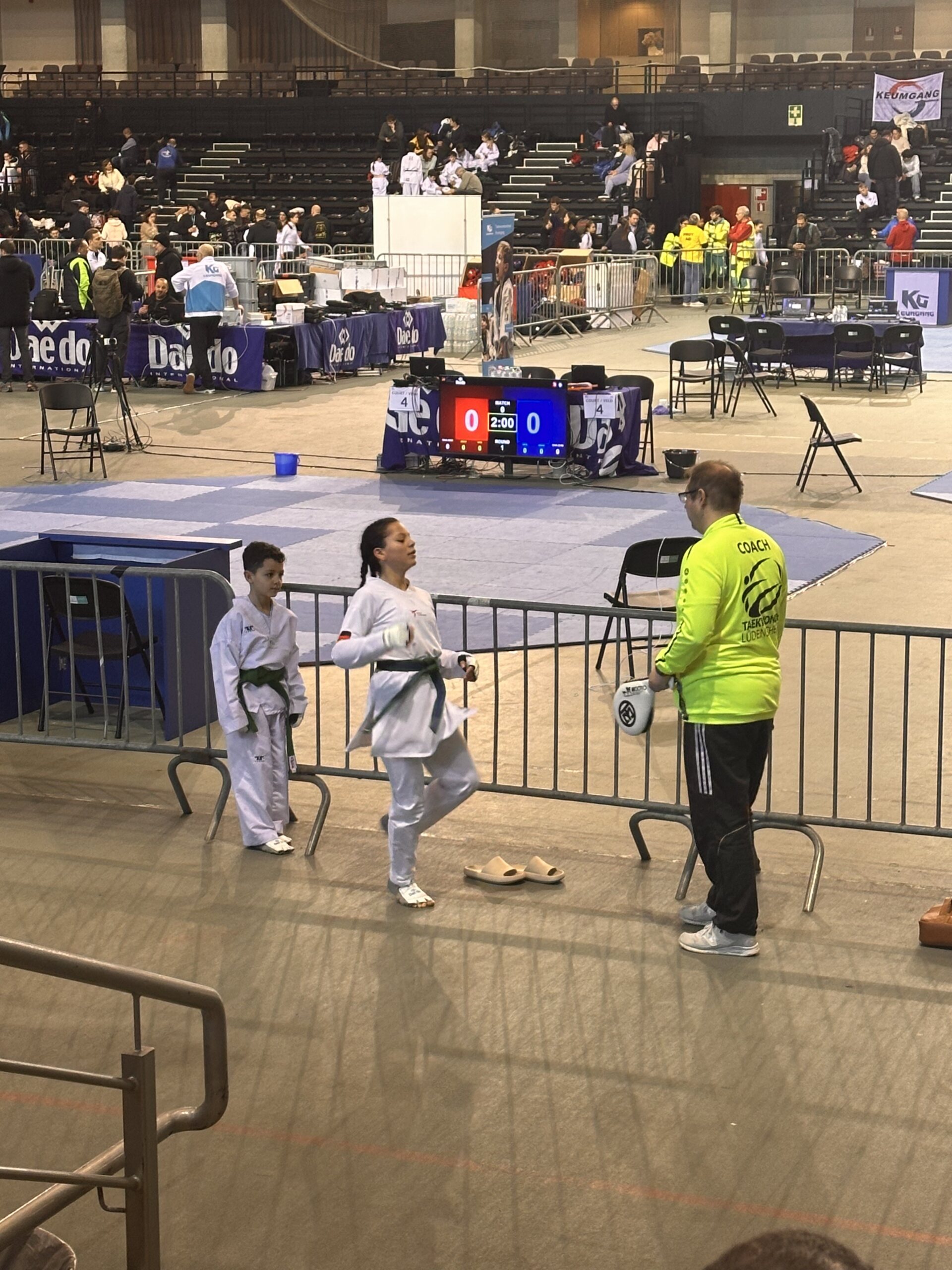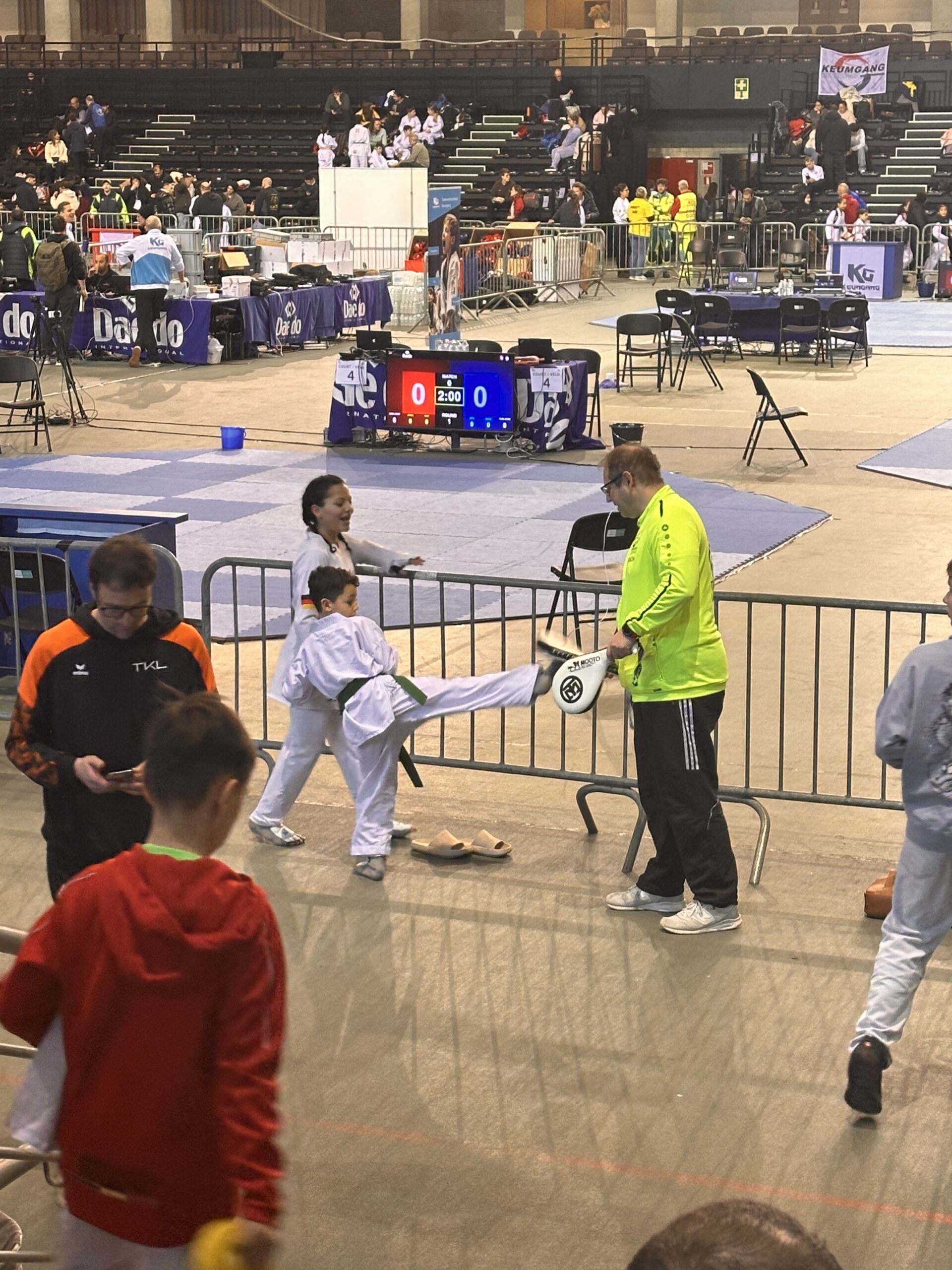 Und das Jahr geht wieder los und wir sind im Kampfmodus. Am 17.01. reisten wir am frühen Morgen mit den Coaches Melek,Michael und Mario und Samira von Lüdenscheid nach Lommel (Belgien), um an den Internationalen Keumgang Open teilzunehmen. Bei diesem hochkarätigen Turnier waren über 950 Starter aus allen Ländern gemeldet. Nach der 2 stündigen Fahrt sind wir rechtzeitig zur Waage angekommen. Die Halle war wie immer das Highlight mit 14 Kampfflächen. Für Esma, Ceyda, Safaa, Sanna, Noah, Leonie und Hamudi war es der erste Auslandseinsatz.