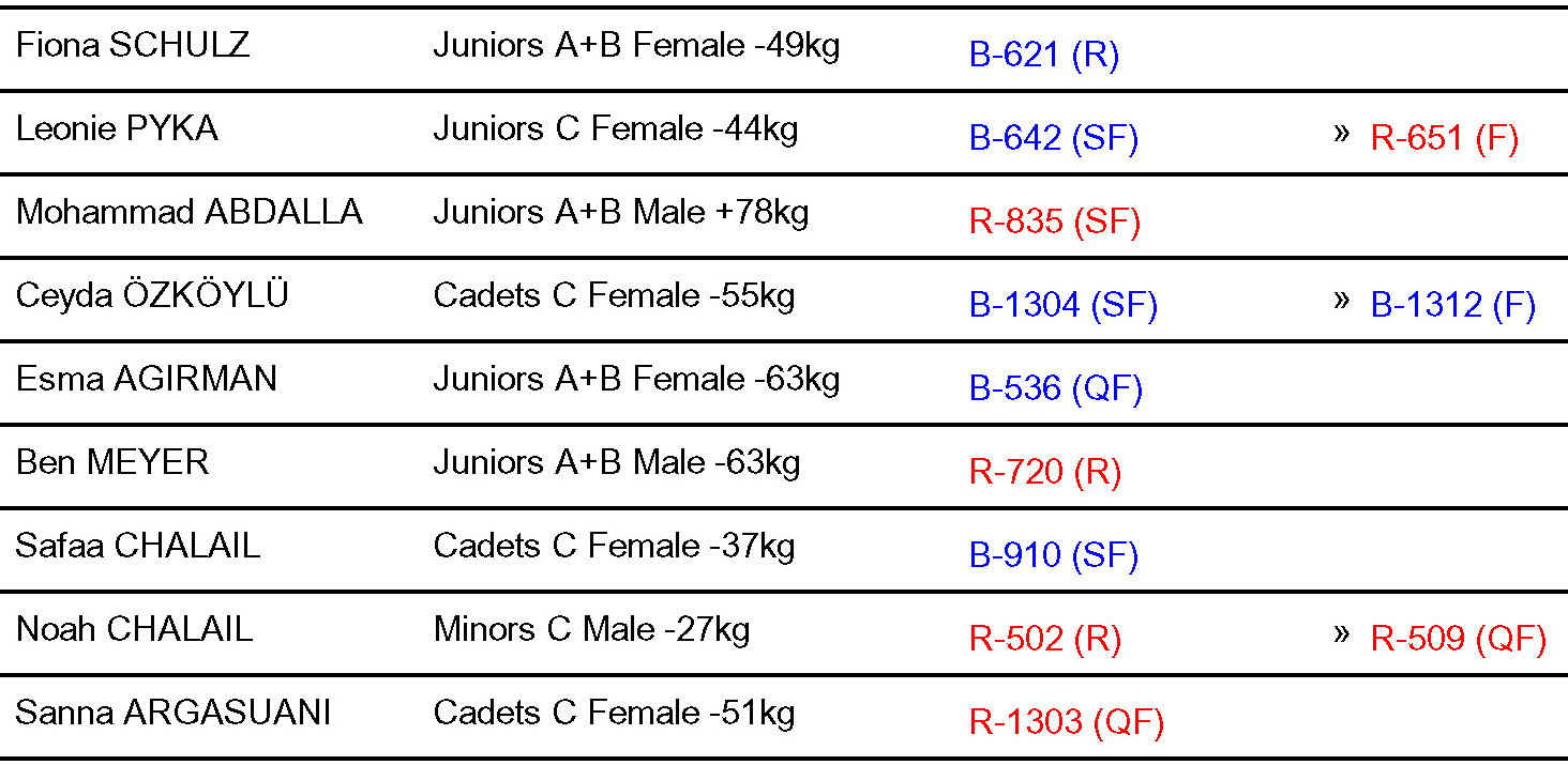 Leider blieben Noah, Esma, Sanna, Fiona und Ben ohne Platzierung, obwohl sie kämpferisch alles gegeben haben. Auch wenn sie nicht ihr Können sauber umsetzen konnten, haben sie schöne Eindrücke von so einem Turnier mal mitnehmen können. Ebenso die Qualität der anderen Kämpfer und auf welchen Stand sie im Vergleich sind.
